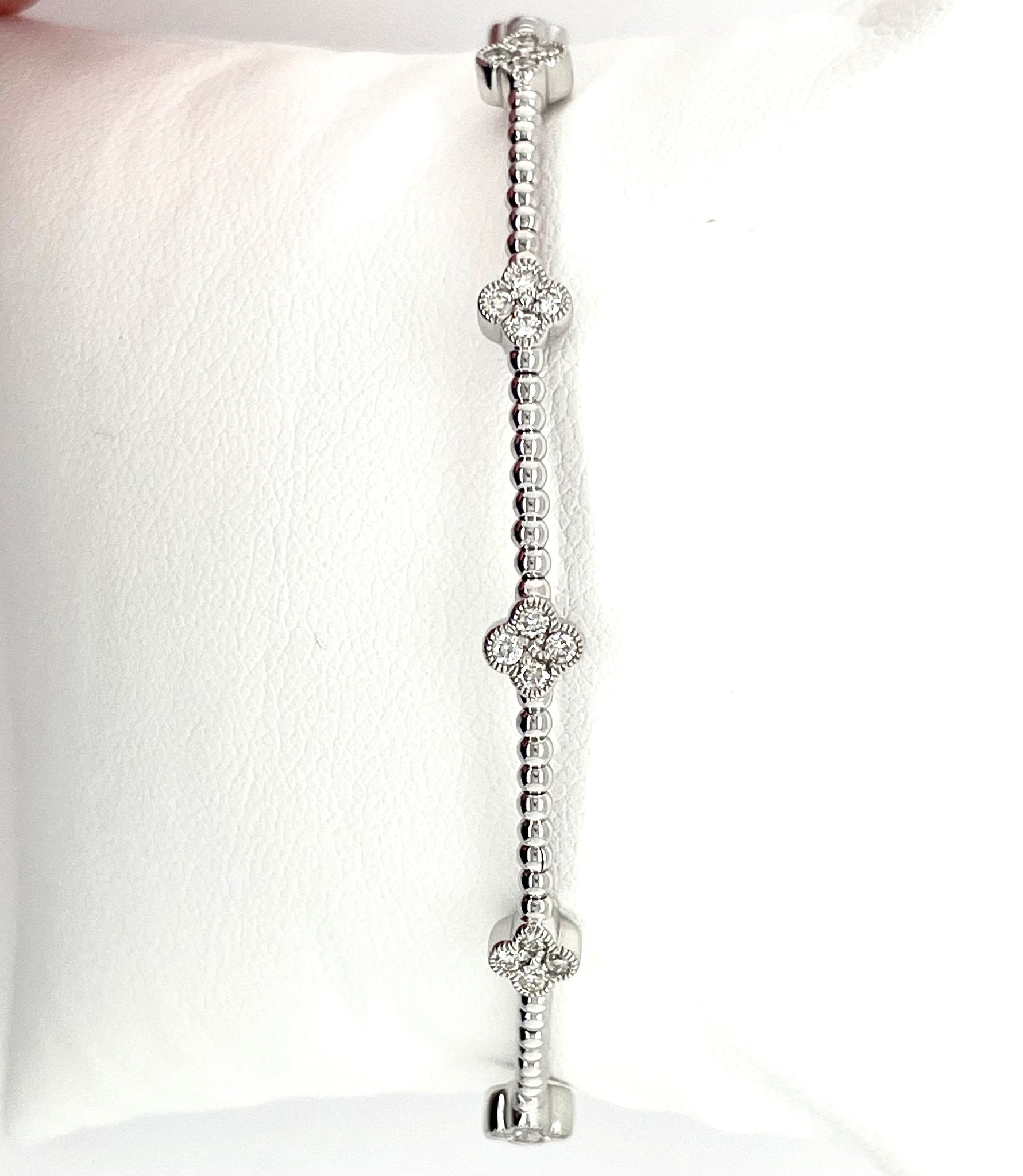 14K White Gold Beaded Hinged Bangle with 7 Diamond Bezel Set Stationary Clusters, Each cluster has 4 round Diamonds 28 total .43ctw